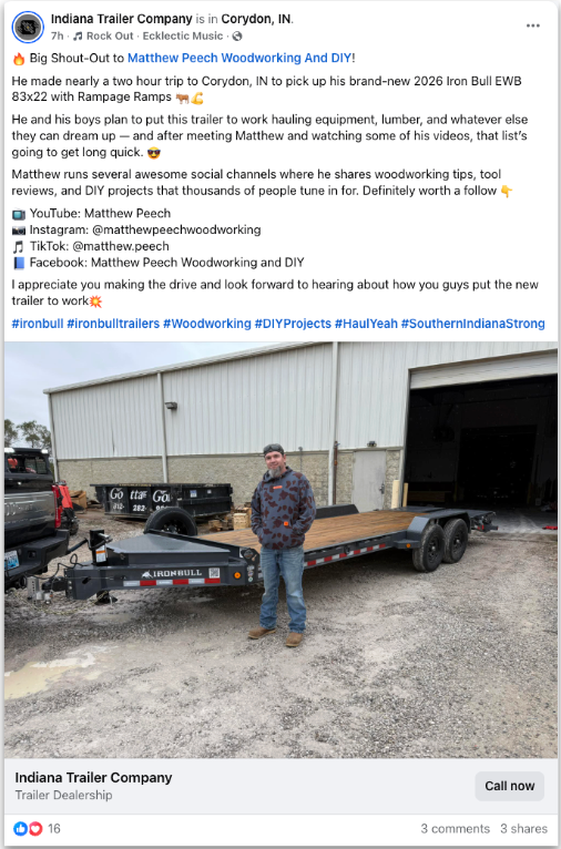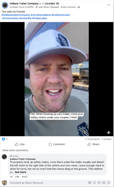 In just a few months, Indiana Trailer Company has built a loyal following, thanks to Ben’s authentic approach to marketing and customer engagement. His main platform? Facebook.